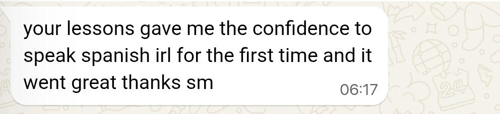 Our classes help you stay motivated with clear goals, clear progress, and let you practice speaking without any pressure.What our students love most is how much focus we put on helping you speak and understand real spoken Spanish, not just grammar.And if you don't like it, we'll give you every cent of your money back. No questions asked.